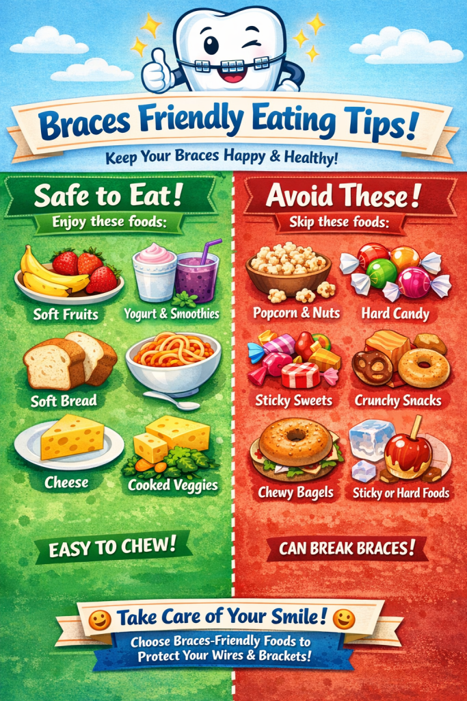 - Follow Dietary Guidelines: Certain foods can damage braces or get stuck in between the brackets and wires, leading to complications. Avoid hard, sticky, or chewy foods that can cause brackets to become loose or wires to bend. Examples include popcorn, chewing gum, hard candies, and nuts. Cut fruits and vegetables into smaller pieces to make them easier to chew.